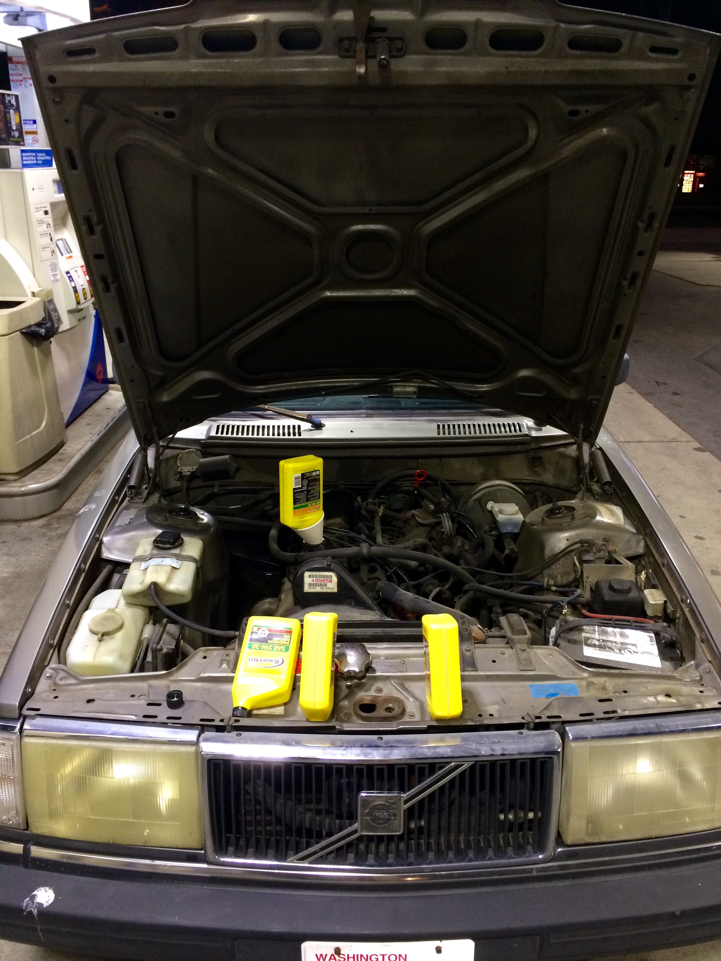 Do you want to see a real picture of “true love”? Right here. You’re looking under the hood of my wife’s ’86 Volvo parked at the AM/PM at 11:15 pm. Why? Because she asked me to fill up her car tonight so she wouldn’t have to do it tomorrow morning on her way to a work conference in Seattle. Of course I agreed, knowing that she would appreciate having that done for her. During the two minute drive to the gas station I noticed the “oil” light was illuminated. So, while the gas was pumping I popped the hood and checked the oil level. It was off the stick! Not good. Once done with the gas I went inside and bought four quarts of motor oil and poured them in.