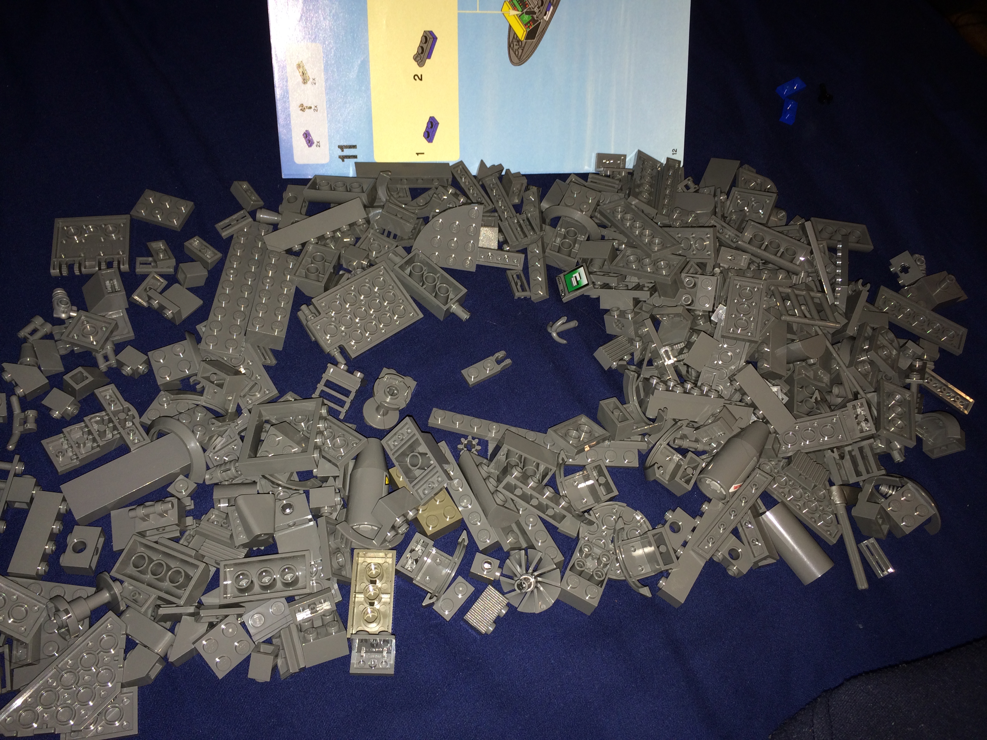 The Lego plane he was building had a booklet of 51 steps for it to be fully assembled. Yeah, fifty one! To complicate matters slightly was the fact that he had taken apart all of his (previously-assembled) Lego kits and separated all of the bricks by color in their own plastic bins. So, for each step we had to open the plastic box (he’s very organized!) that corresponded to that brick’s color and find it. Think “needle in a haystack” for every single brick.