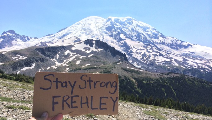 PS-I made this sign and took it with me on a hike at Mt. Rainier with my son on Saturday. The mountain is a sacred and spiritual place for me. I could think of no better way to honor the inspiration that I’ve drawn from Frehley’s courageous fight than to bring her message to the mountain. Stay Strong, Frehley.