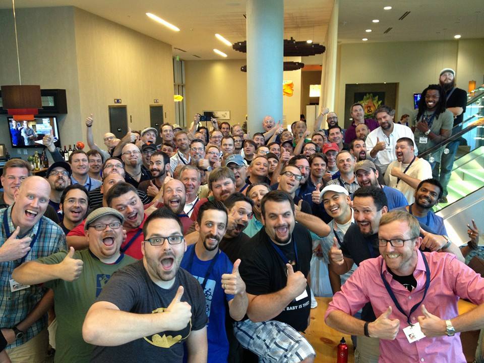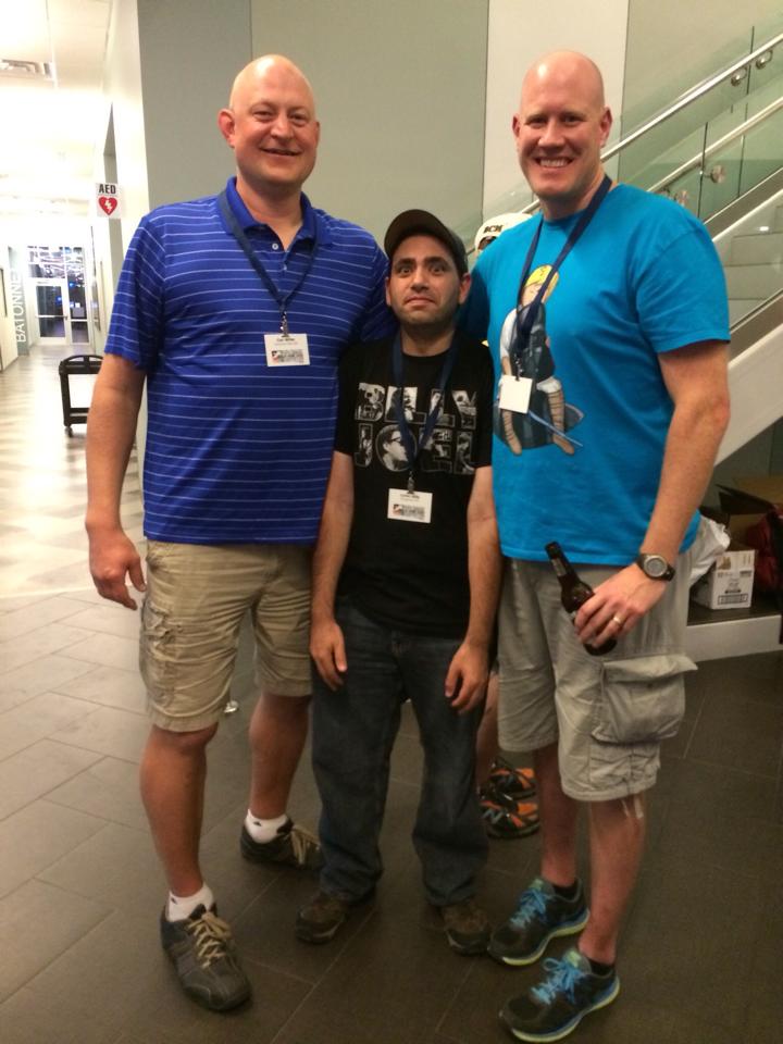 Pictures. I’m always in back. I could probably wear only underwear and no one would ever know by looking at 95% of all group pictures in which I’ve been a participant. (Why can’t I write like I talk and not care about using a dangling participle?) “Line up shortest to tallest” is the easiest directive for this guy. Walk to the back and laugh at everyone eyeing up who is taller/shorter. I’ll be in back. Always. I also sometimes forget just how big I am compared to “normal” sized people. Just last month at the NAHDN Convention in Denver I had the opportunity to mingle with over 100 other SAHDs from around the U.S. and Canada. My buddy Chris (SAHD and blogger at DadNCharge) is 6’7″ and we decided to take a picture with our friend Lorne (SAHD and blogger at Raising Sienna) at the request of his family. Lorne isn’t tiny as much as Chris and I are really, really tall. We literally dwarfed poor Lorne. After more than 20 years of being so crazy tall, I guess I sometimes forget that I’m probably the tallest person most people actually know. Sure, you might see a random really tall person somewhere or on TV, but to actually be right next to that person and interact with him/her is a bit different.